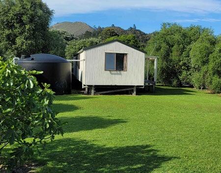 The bach is 30 years old now, and showing its age. It was relocated from Whangarei when the kids were toddlers. They had fun “helping” to get it on site from a truck and tied down to its foundation.